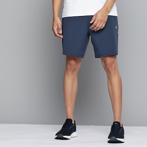 Blue solid mid-rise running sports shorts, has 3 pockets, drawstring closure