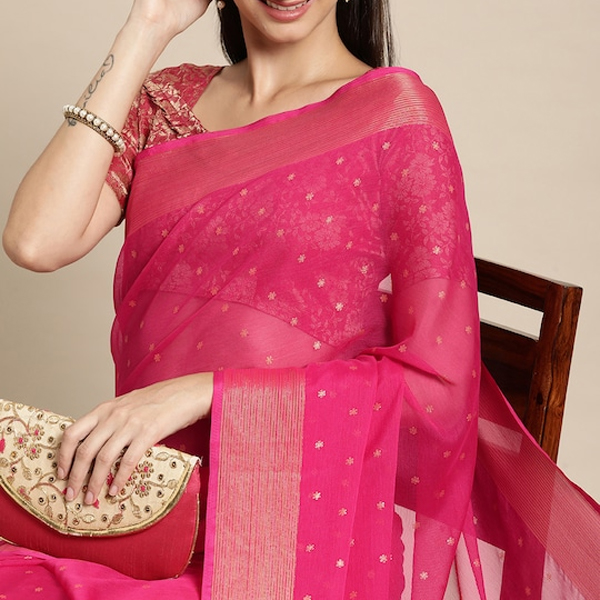 0 review(s) for "Pink & Gold-Toned Floral Zari Pure Chiffon Saree"