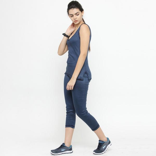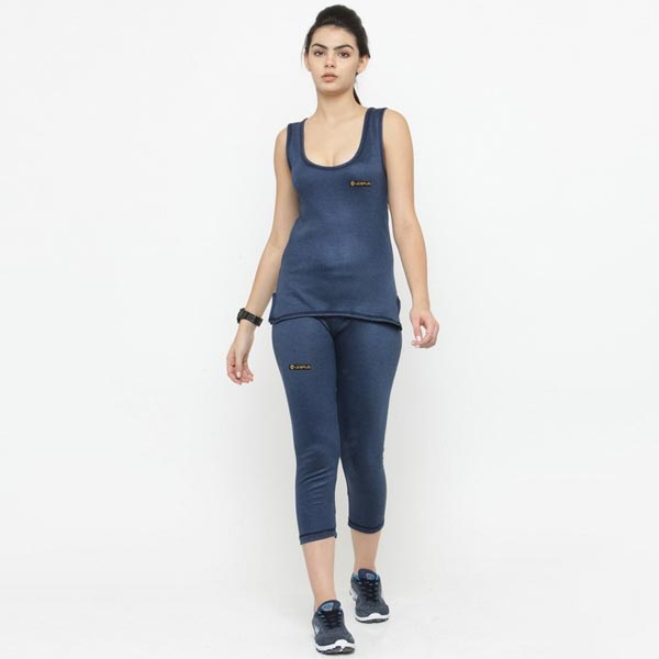 Navy blue self-design thermal top, has a scoop neck and sleeveless