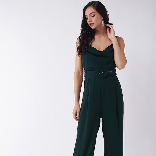 Green solid basic jumpsuit, has a shoulder straps, belt at the waistline with straight cut bottoms