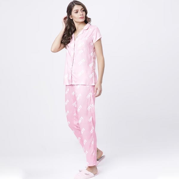 Pink and white printed shirt, has a lapel collar, short sleeves